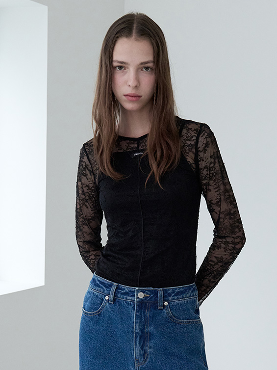 SHIRRING SEE-THROUGH HIGH NECK T-SHIRT BLACK
