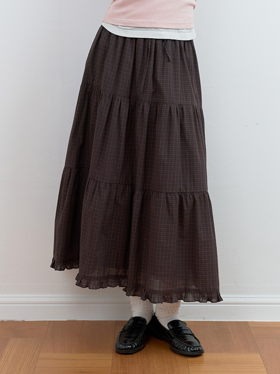 CHECK TIERED LONG SKIRT GR+NV